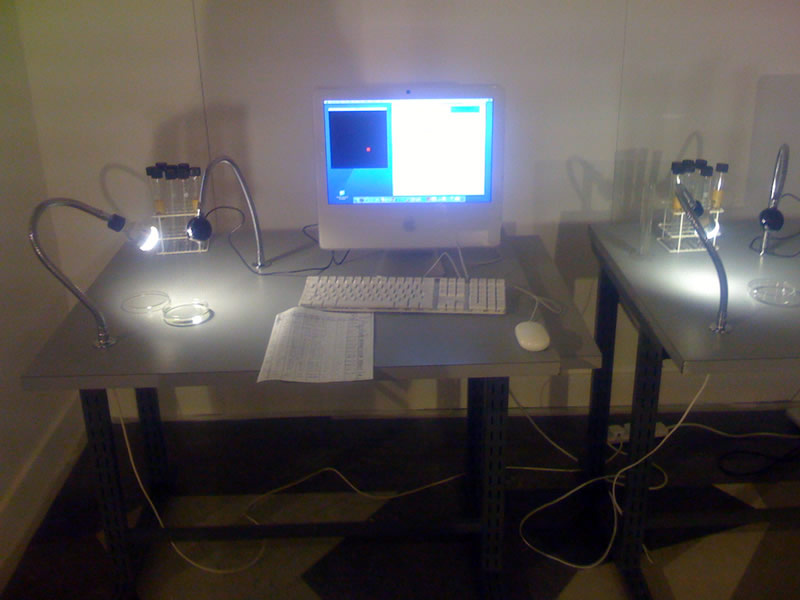 >The 18th of April 2009, the Softday Bacterial Ensemble performed the live music and multimedia Nobody Leaves ’till the Daphnia Sing. The performance with both humans and Daphnia Magna was a once off, but the INFECTIOUS exhibition and our installation with the Daphnia runs until the 17th of July 2009.
